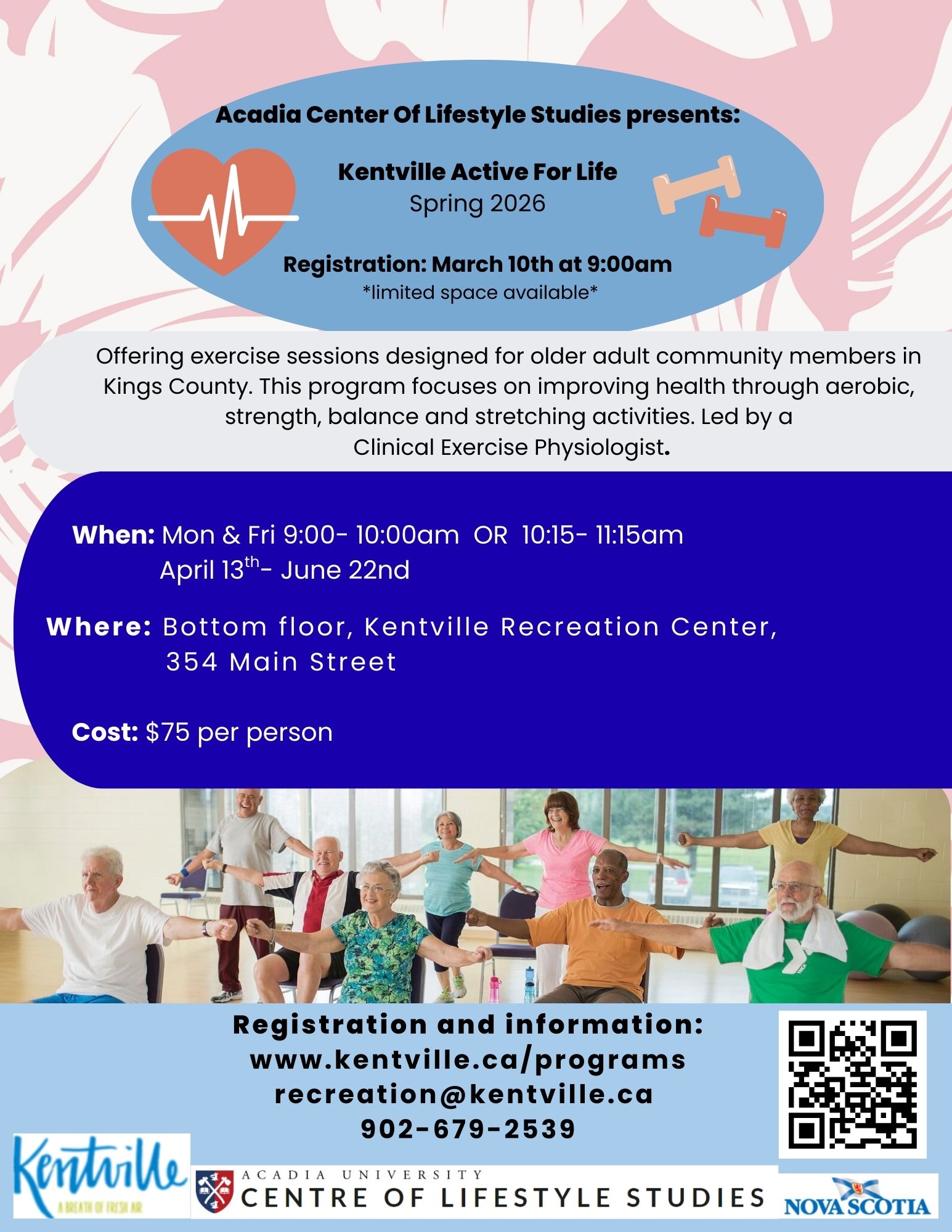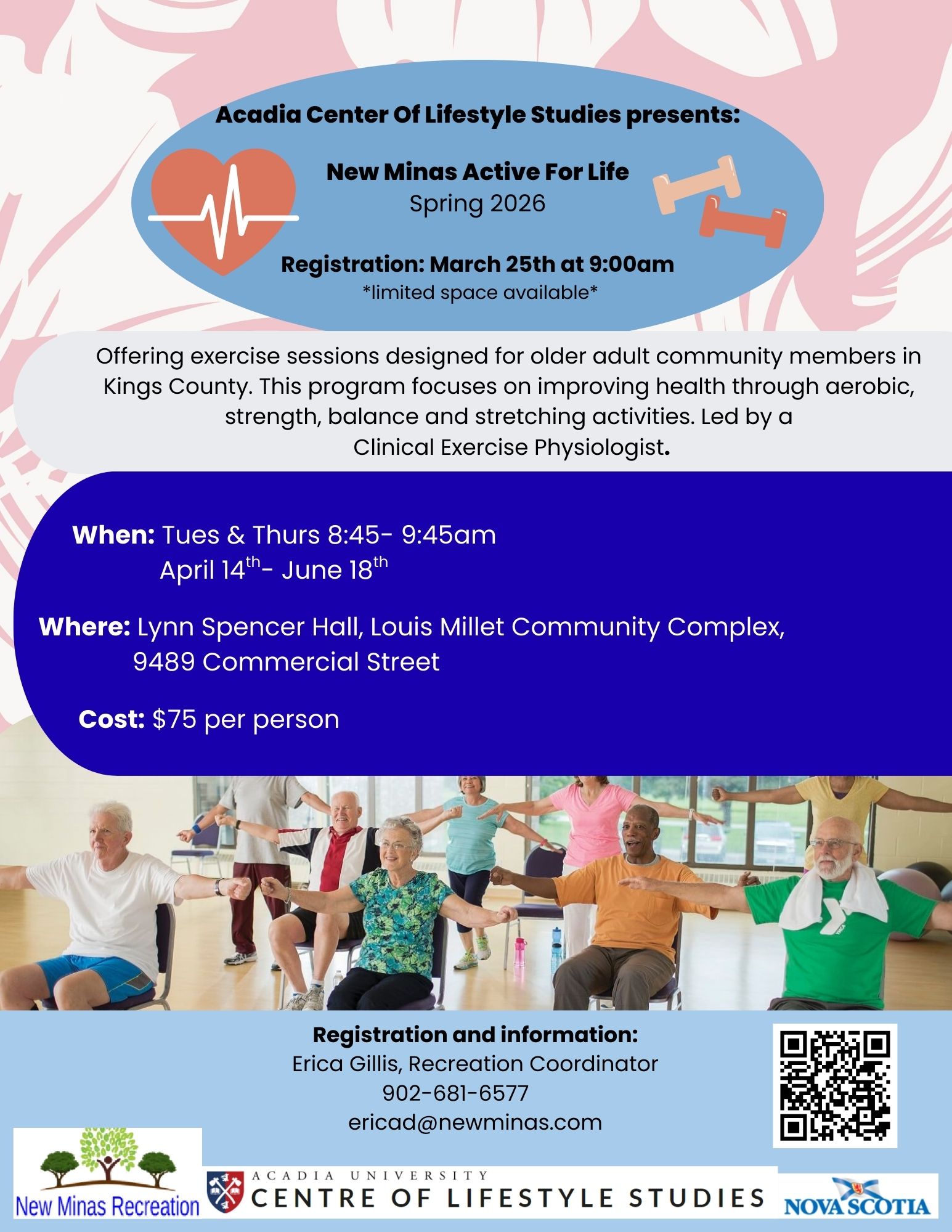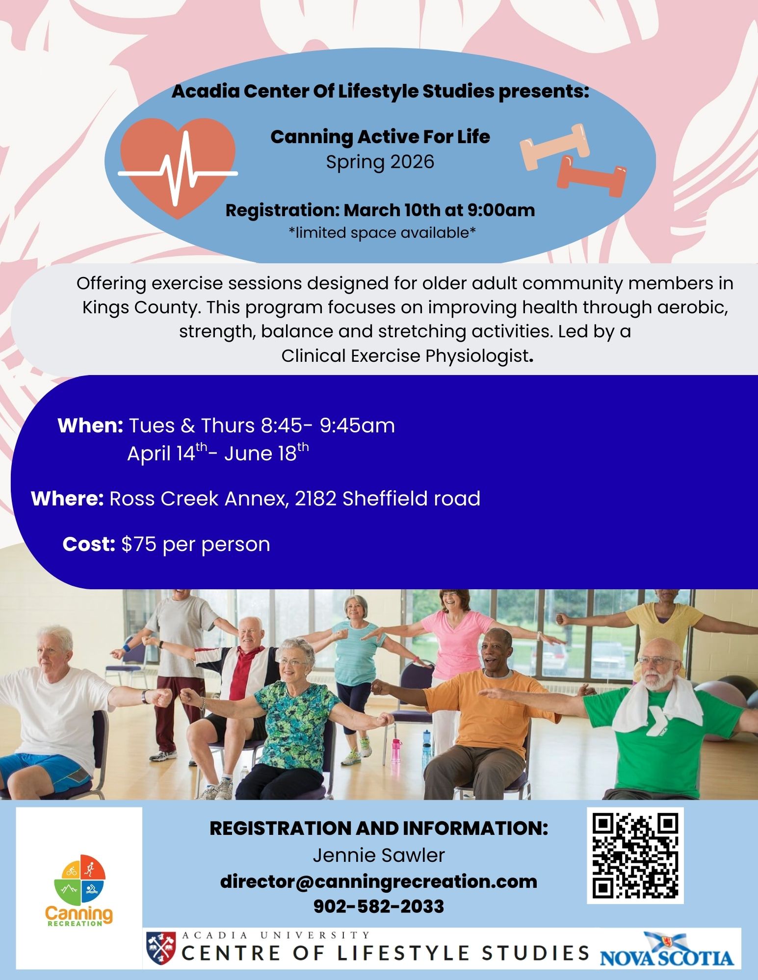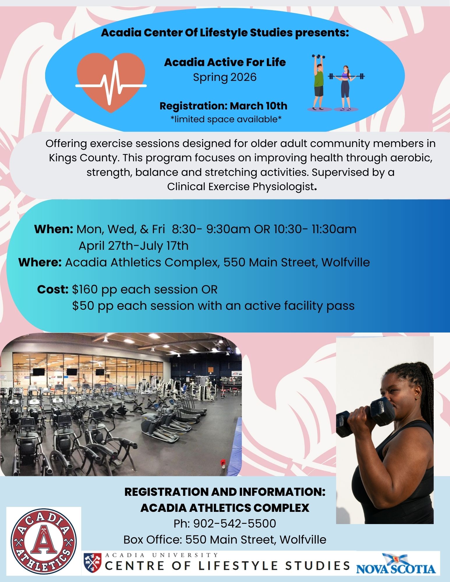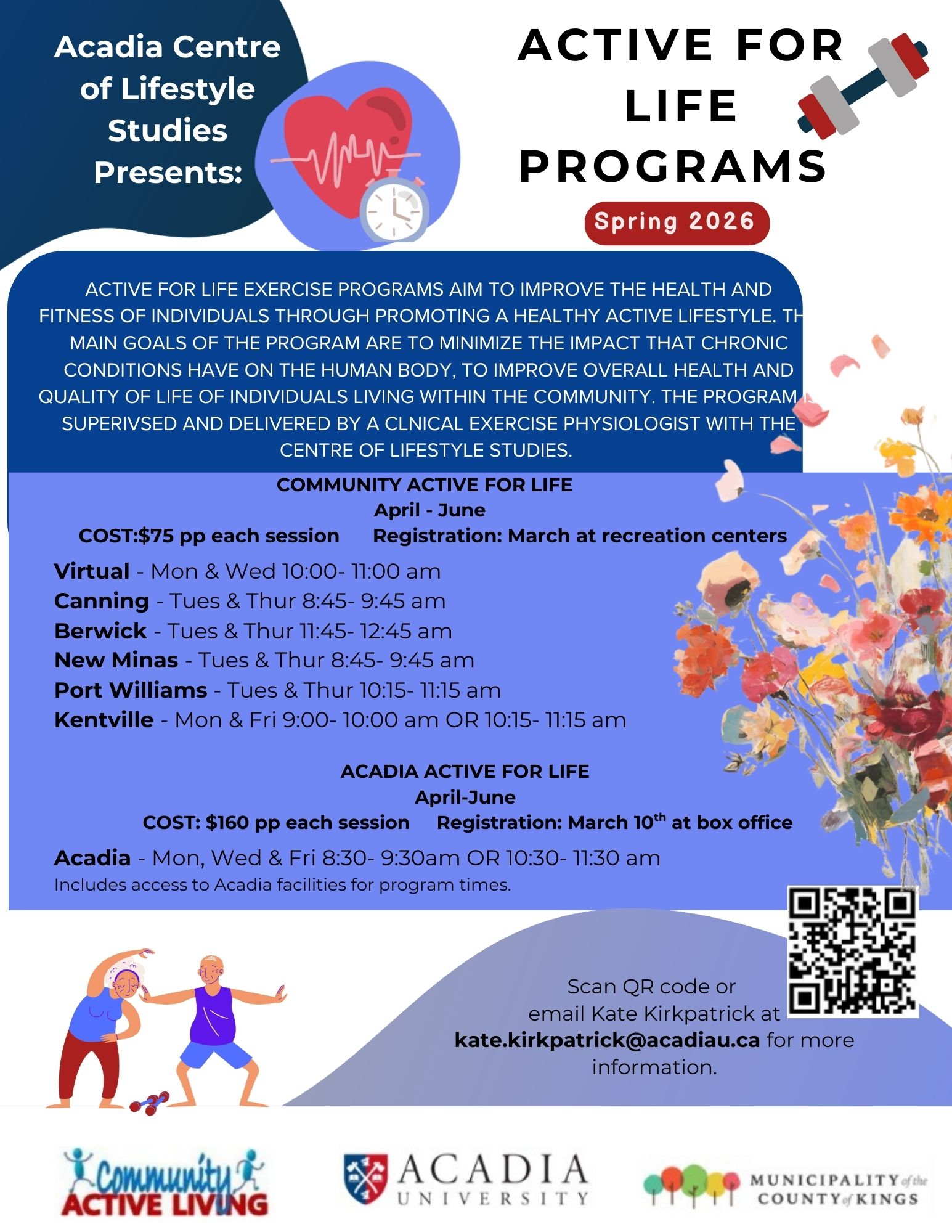 The contact for information and to register for the program is activelivingprograms@acadiau.ca .
